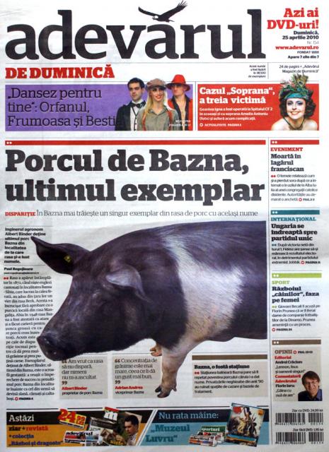 Adevărul îi plânge de milă unui porc, deşi acesta a intrat ilegal în România (o să vedeţi mai jos de ce). Ultimul exemplar din “Porcul de Bazna” se lăfăie pe prima pagină din Adevărul şi îşi înfige râtul în textul jurnaliştilor de la Adevărul care exploatează exclusivitatea.