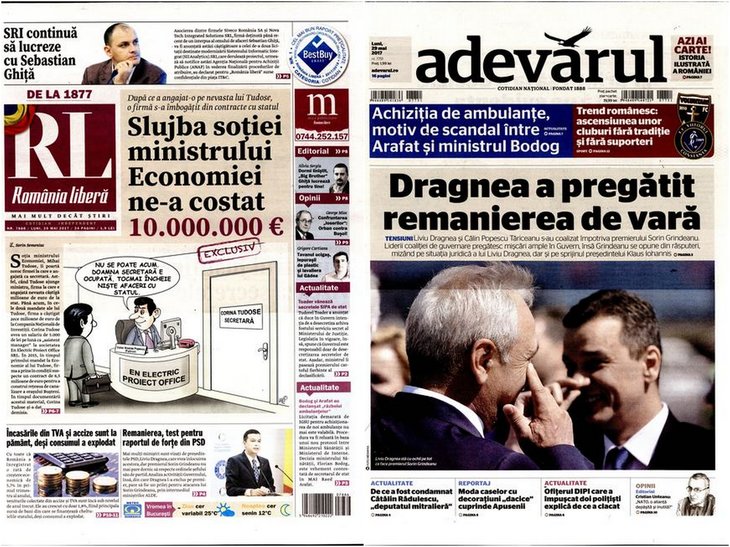 Potrivit Adevărul, "Liviu Dragnea şi Călin Popescu Tăriceanu s-au coalizat împotriva premierului Sorin Grindeanu. Liderii coaliţiei de guvernare pregătesc mişcări ample în Guvern, însă Grindeanu se opune din răsputeri, mizând pe situaţia juridică a lui Liviu Dragnea, dar şi pe sprijinul preşedintelui Klaus Iohannis."