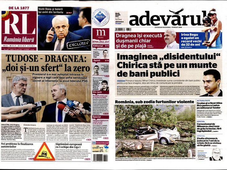 Subiectele din presa de azi. Mihai Tudose a numit un nou şef la serviciul secret al Ministerului de Interne, fără a mai aştepta ca acesta să fie ales de "omul de încredere" al lui Liviu Dragnea, ministrul de Interne Carmen Dan, scrie azi România liberă. În Adevărul, primarul Iaşului, Mihai Chirica, "investeşte sume consistente din bani publici pentru a-şi face imagine".
