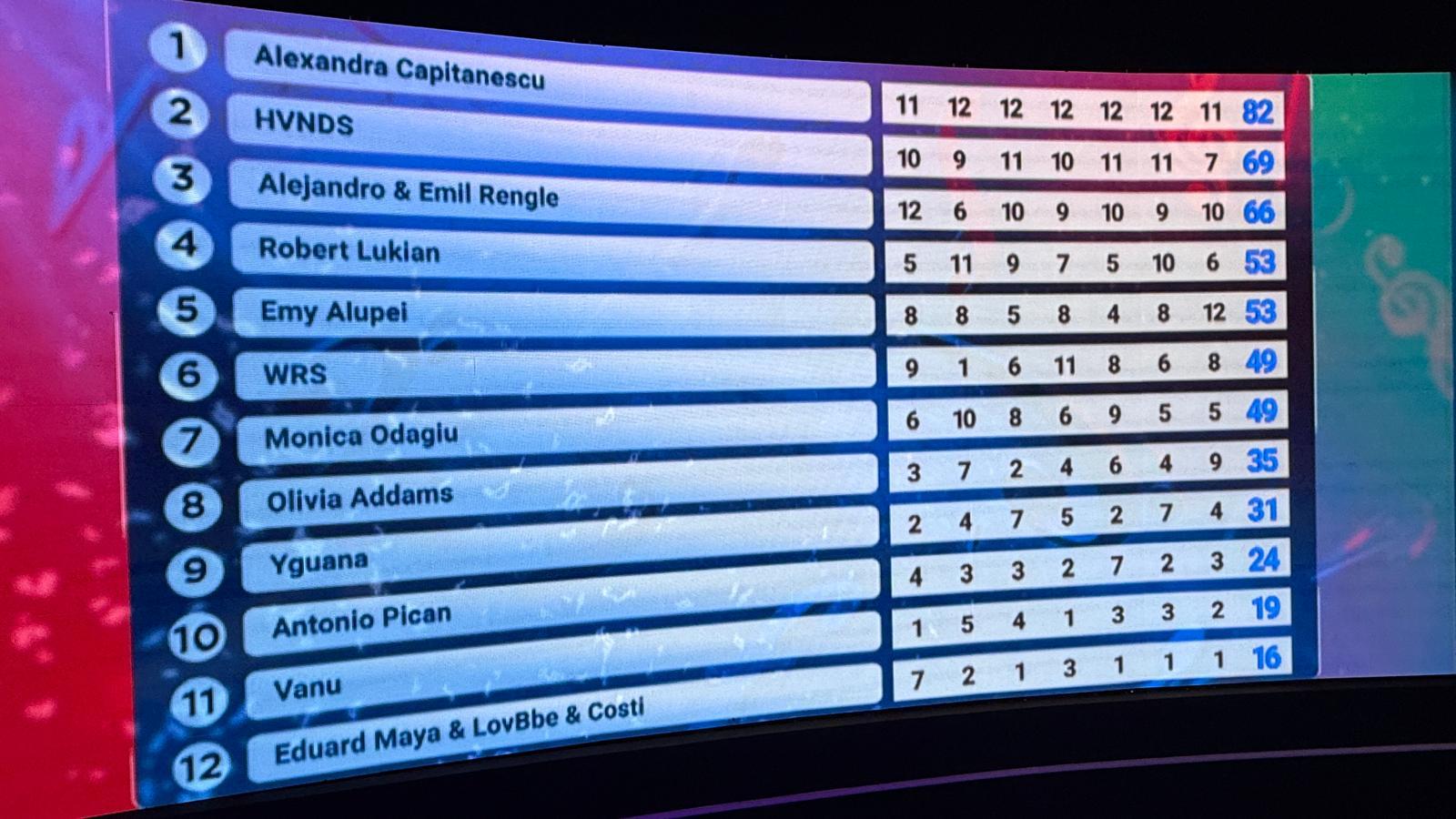 La selecţia organizată de TVR, Alexandra Căpitănescu a obţinunt un punctaj aproape maxim: 82 din 84 de puncte posibile. Următoarele locuri au fost obţinute de HVNDS (69) şi de Alejandro & Emil Rengle (66).