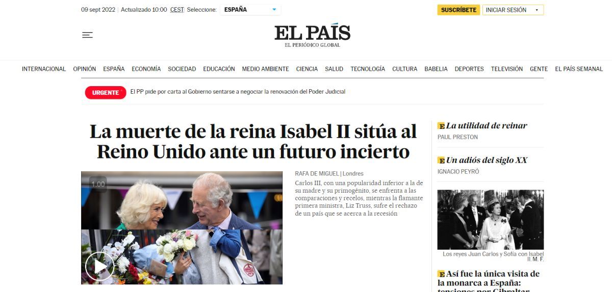 „Moartea Reginei Elisabeta a II-a plasează Regatul Unit într-un viitor incert”, afirmă publicaţia spaniolă El País. „Charles al III-lea, cu o popularitate mai mică decât mama sa şi decât fiul său cel mare, se confruntă cu comparaţii şi îndoleieli, asta în timp ce noul prim-ministru, Lizz Truss, suferă de respingerea unei ţări care se apropie de o recesiune”, mai notează spaniolii.