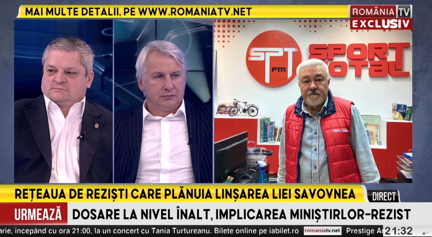 Captură foto de la România TV, cu comentatorul Ionel Stoica, prezentat ca făcând parte din „Reţeaua de rezişti care plănuia linşarea Liei Savonea”